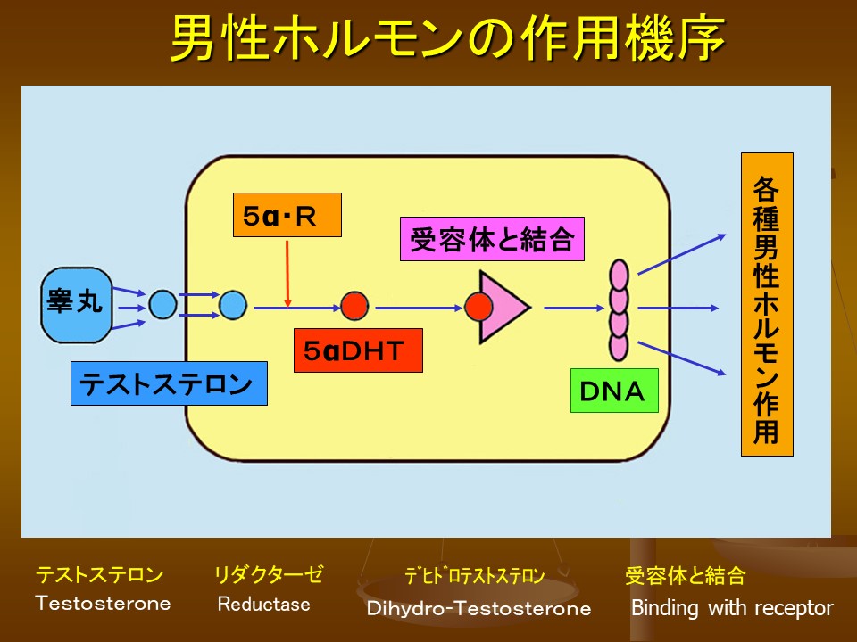 (ロ)レセプターに結合するのを阻害する薬剤としては、実用化には相当先のことになるでしょうが、スピロノラクトン、酢酸シプロテロンがあり、培養系に添加すると、テストステロンの細胞増殖を抑制することが報告されています。ミノキシジルの場合もメーカーによると男性ホルモンの受容体をブロックするとされています。