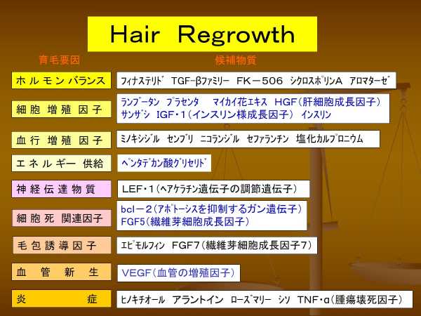 ヘアサイクルを伸ばす「細胞死関連物質」としては、アポトーシスを抑制するガン遺伝子のbc1−2や繊維芽細胞成長促進因子のFGF−5などが研究されています。(FGF=表皮細胞増殖因子)