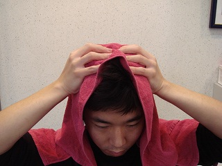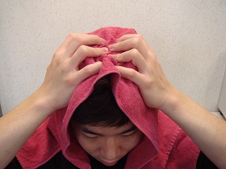 次に乾いたタオルを頭にかぶせ、手の平でその上からポンポンと叩いたり、指頭で揉むようにマッサージして水分を拭き取ります。そして、頭皮が乾く前に育毛剤を頭皮に塗り込みます。これは乾いたスポンジの上に水をたらしても吸い込まないのに、一度水につけて絞ったスポンジに水をたらすと、スーッと吸い込んでいくのと同じなのです。乾いた頭皮より水分を含んだ頭皮の方が育毛剤は浸透しやすいのです。(テレヒ、それダメ!紹介)