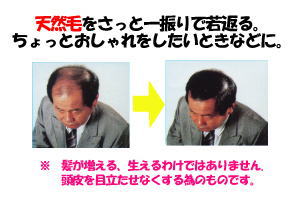 一般的には「瞬間増毛剤」とか「ふりかけ」とよばれているもので、長さ0.3〜0.5mmの微細の人工毛を薄毛の部分の頭皮に散布し、静電気や汗、皮脂などで頭皮に付着させ、視覚的に増毛効果をねらった薄毛かくし用の微粉末毛で、簡単に毛髪がフサフサに増えたように見えるようにすることができます。頭皮から吸収されるようなことはありません。一般品より容器が細く、細かなカバーがやりやすくなっています。ブラックとダークブラウンの2タイプ |